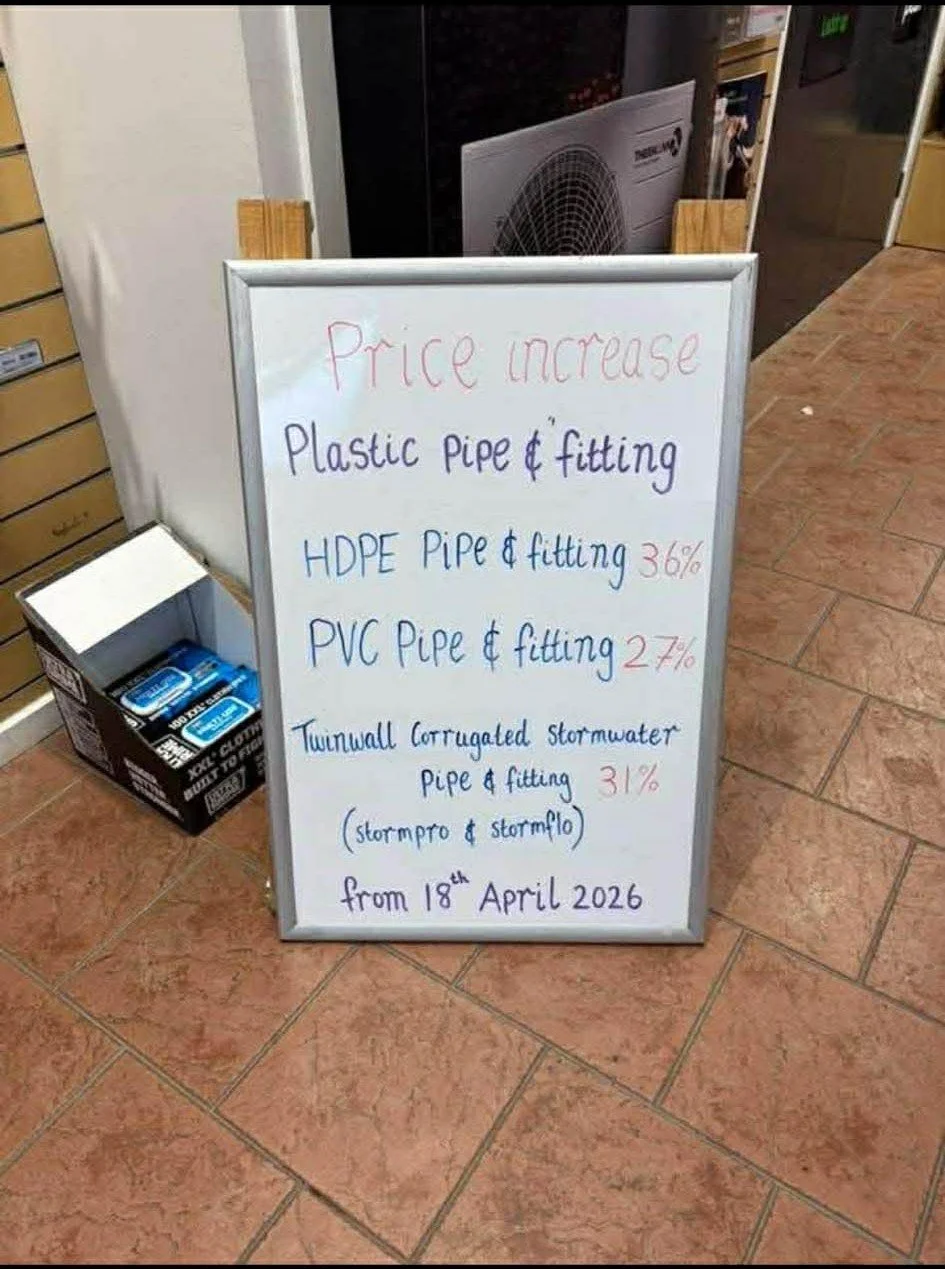 We’re seeing it first-hand. Suppliers have begun adding fuel levies almost immediately, delivery charges have increased, and product pricing is being adjusted at a pace we don’t normally experience. In some cases, the changes are significant. Plumbing PVC, for example, has increased by up to 40% in certain product lines. These aren’t minor fluctuations—they are substantial shifts that directly impact the cost of delivering a job.